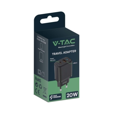 Ładowarka USB V-TAC szybka 20W czarna mini dual USB type-A type-C VT-3530