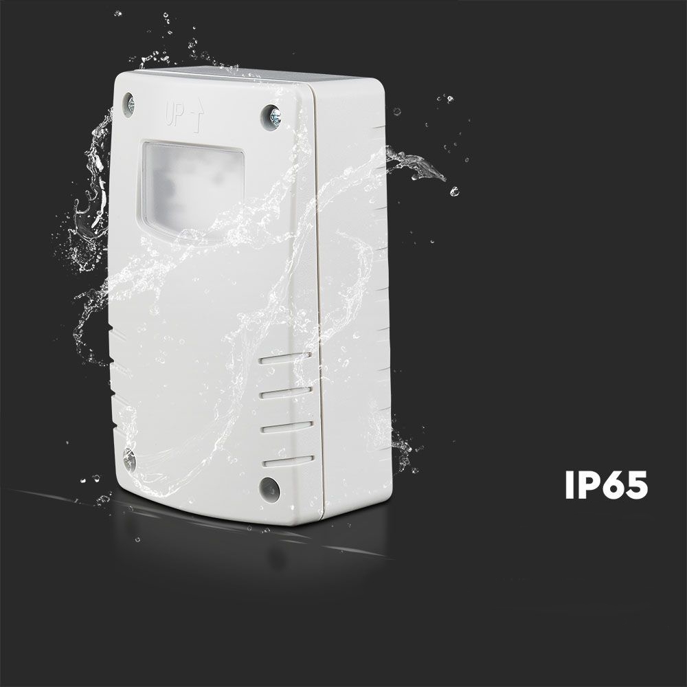 Stopień ochrony IP65 gwarantuje, że czujnik jest odporny na wnikanie kurzu i jest chroniony przed strumieniami wody z dowolnego kierunku, co czyni go idealnym do zastosowań zewnętrznych. Dzięki tej wysokiej odporności, czujnik światła V-TAC może być bezpiecznie używany w różnorodnych warunkach atmosferycznych, zapewniając niezawodność i długotrwałą pracę systemu oświetleniowego.