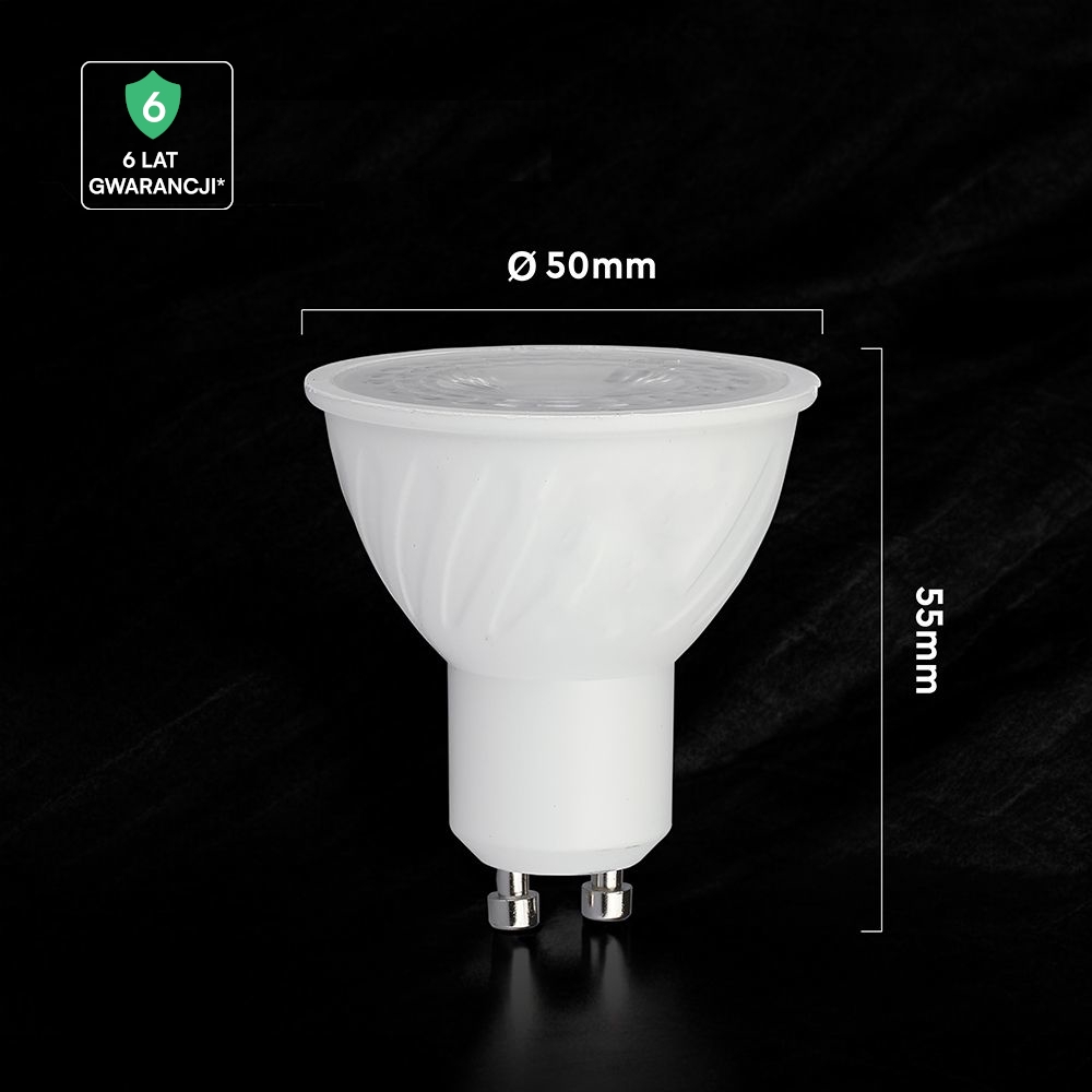 Żarówka LED V-TAC GU10 z gwarancją 6 lat wykorzystuje chipy CREE nowej generacji, które zapewniają wyjątkową niezawodność, wysoką efektywność i długi czas życia. CREE LED to światowy lider w technologii oświetlenia z ponad 35 letnim doświadczeniem i ponad 1800 patentami, co przekłada się na stabilną pracę oraz wysoką jakość światła. Model o mocy 6W stanowi energooszczędny zamiennik tradycyjnej żarówki halogenowej 60W. Konstrukcja żarówki została wykonana z wytrzymałych materiałów zapewniających lekkość i łatwy montaż w standardowych gniazdach GU10. Długi czas życia wynoszący 25000 godzin sprawia, że żarówka świetnie nadaje się do wieloletniego użytkowania w przestrzeniach mieszkalnych i komercyjnych.