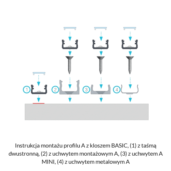 - uchwyty montażowe do profili z kloszem BASIC oraz z kloszem HIGH w 3 odmianach kolorystycznych - transparentny, biały, czarny,