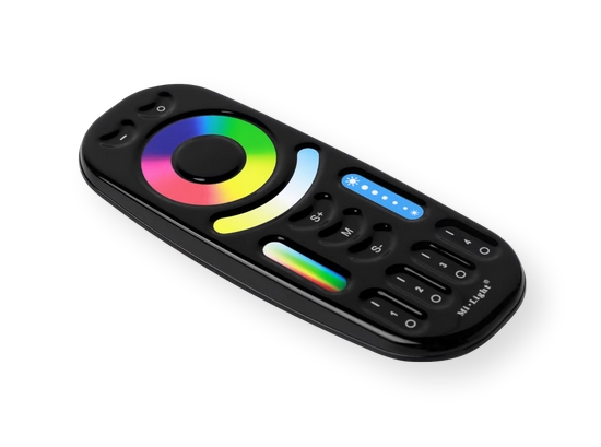 4-strefowy pilot FUT092-B obsługiwany dotykowo. Umożliwia zmianę koloru, nasycenia koloru, temperatury barwowej oraz jasności przypisanych urządzeń. Montowany do uchwytu.