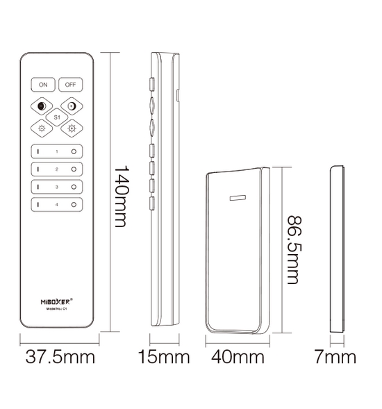 4-strefowy pilot C1 obsługiwany na przyciski. Umożliwia zmianę temperatury barwowej oraz jasności przypisanych urządzeń. Montowany do uchwytu.