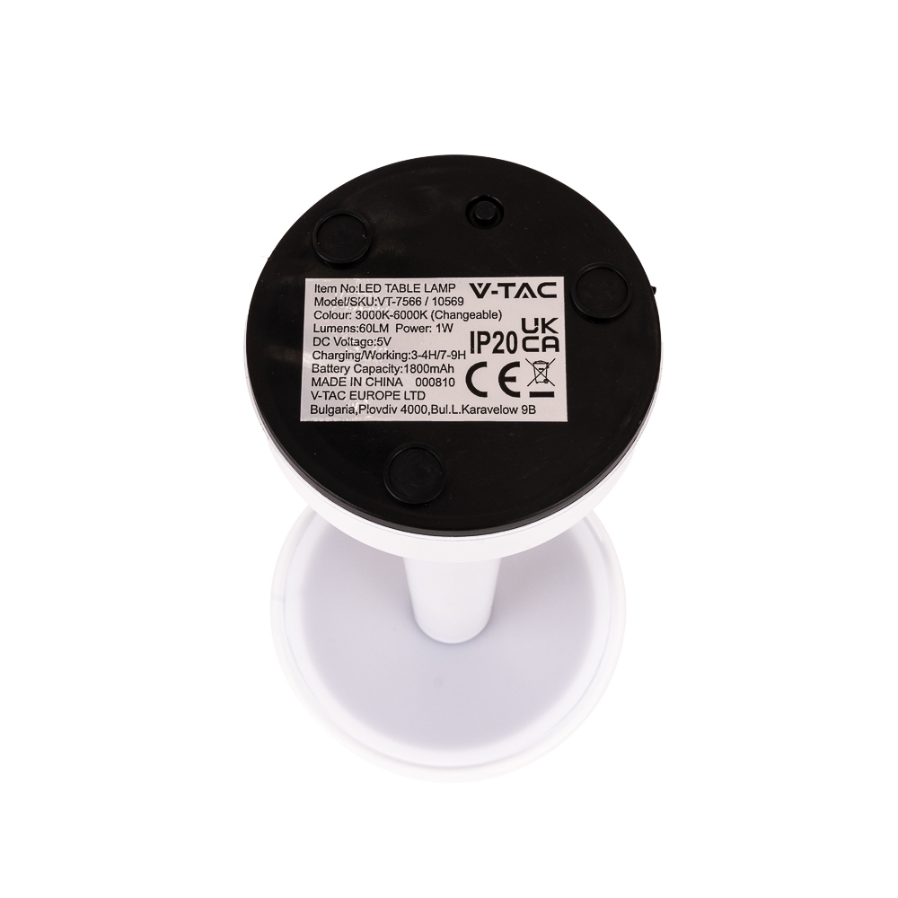 Lampka stołowa nocna V-TAC 2W LED 23cm ładowanie USB CCT ściemnianie biała VT-7566 3000K-6000K 40lm