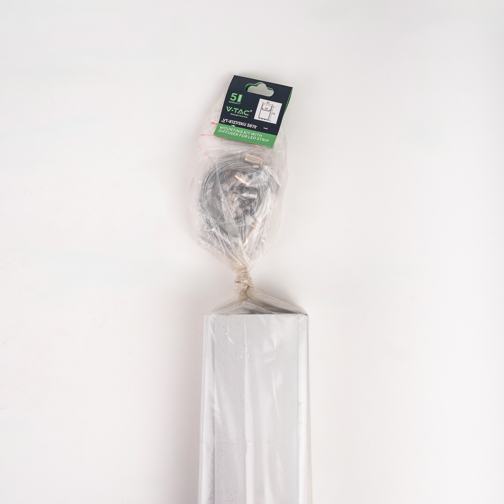 W zestawie, profil 2 metry, 4 zaślepki końcowe z kompletem śrub , 2 komplety linek umożliwiających zwieszenie oprawy oraz klosz mleczny