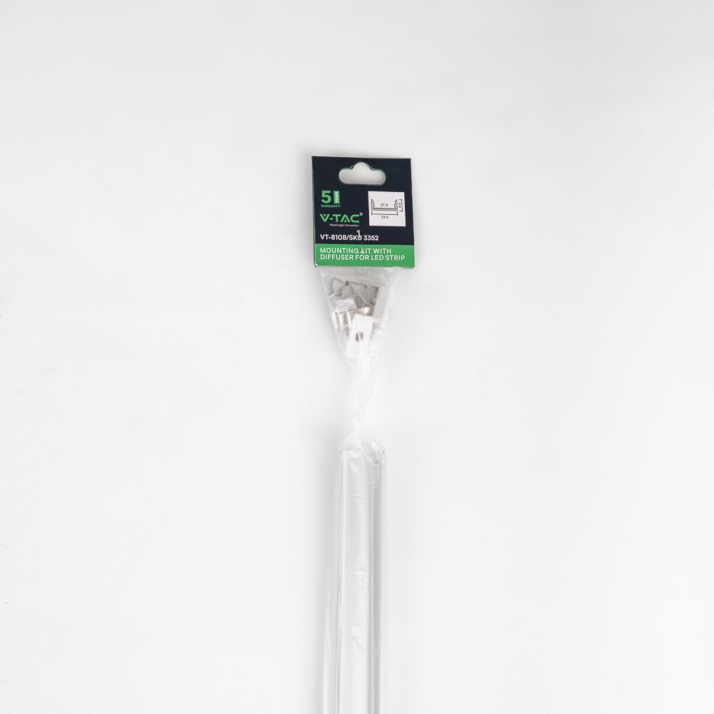 W zestawie, profil 2 metry, zaślepki końcowe, uchwyty montażowe oraz klosz mleczny