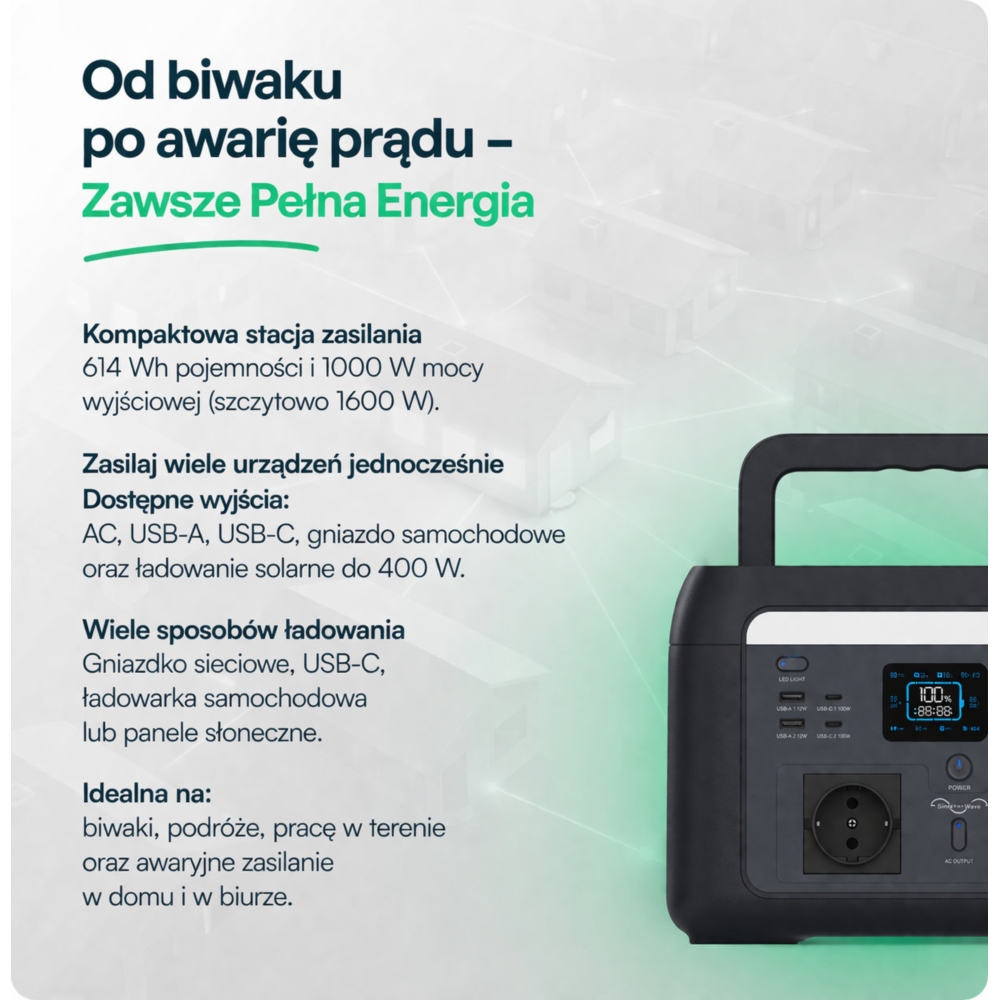 Model oferuje moc wyjściową 1000W z czystą sinusoidą, co pozwala na bezpieczne zasilanie urządzeń elektronicznych, sprzętu AGD oraz narzędzi mobilnych. Dzięki wysokiej mocy szczytowej możliwe jest również uruchamianie bardziej wymagających urządzeń