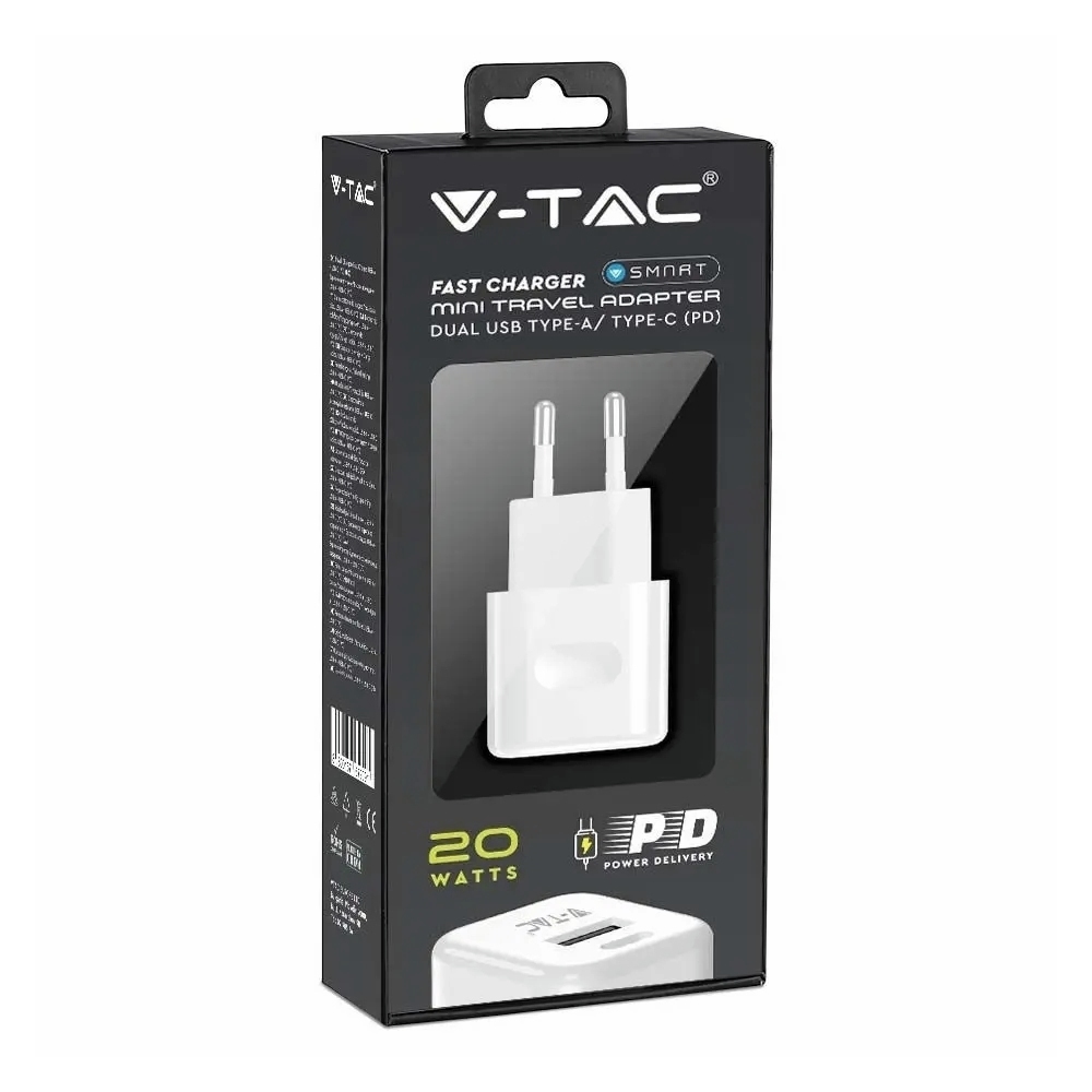 Ładowarka USB V-TAC szybka 20W biała mini dual USB type-A type-C VT-5320-W