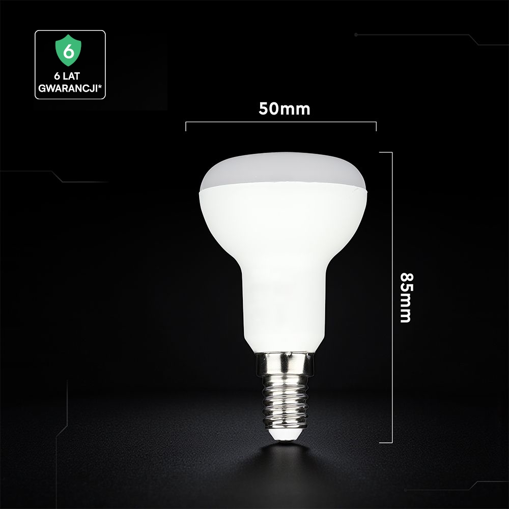 Żarówka LED V-TAC R50 z trzonkiem E14 posiada gwarancję 6 lat oraz wykorzystuje nowoczesną technologię SMD CREE która zapewnia wysoką niezawodność, trwałość i doskonałą wydajność świetlną. Chipy CREE są światowym liderem w technologii LED z ponad 35 letnim doświadczeniem i ponad 1800 patentami co gwarantuje stabilną pracę i długi czas życia produktu. Model o mocy 4.8W stanowi energooszczędny zamiennik tradycyjnej żarówki halogenowej 40W. Strumień świetlny 470 lumenów oraz szeroki kąt świecenia 120 stopni umożliwiają równomierne oświetlenie przestrzeni mieszkalnych, komercyjnych oraz dekoracyjnych. Żarówka została wykonana z wytrzymałych materiałów zapewniających lekkość i łatwy montaż, a długi czas życia 25000 godzin gwarantuje wieloletnie użytkowanie bez konieczności częstej wymiany.
