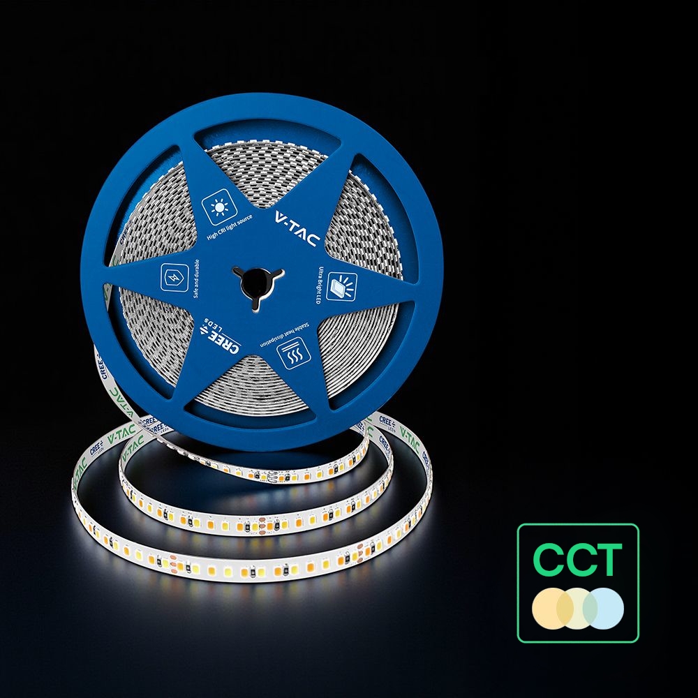 Taśma LED V-TAC CREE posiada gwarancję 6 lat oraz wykorzystuje wysokowydajne diody SMD 2835 od CREE co zapewnia wyjątkową skuteczność świetlną i długi czas życia. Produkt charakteryzuje się bardzo wysokim współczynnikiem oddawania barw CRI powyżej 90 dzięki czemu barwy otoczenia wyglądają naturalnie i są wiernie odwzorowane. Kluczową cechą jest szerokość paska wynosząca około 8 mm co umożliwia jego montaż w typowych profilach aluminiowych i instalacjach meblowych. Taśma generuje bardzo wysoki strumień świetlny 1425 lumenów na metr przy poborze mocy 15W na metr oferując mocną i równomierną linię światła. Gęstość 192 diod na metr eliminuje efekt punktów świetlnych zapewniając pełną, jednolitą linię. Zasilanie 24V DC gwarantuje stabilną pracę oraz minimalny spadek napięcia nawet na długich odcinkach. Elastyczna konstrukcja pozwala na łatwe cięcie taśmy w wyznaczonych miejscach oraz dopasowanie jej do złożonych projektów oświetleniowych. Produkt wspiera regulację barwy CCT 3w1 co umożliwia uzyskanie szerokiego zakresu temperatury światła w zależności od zastosowanego sterownika.