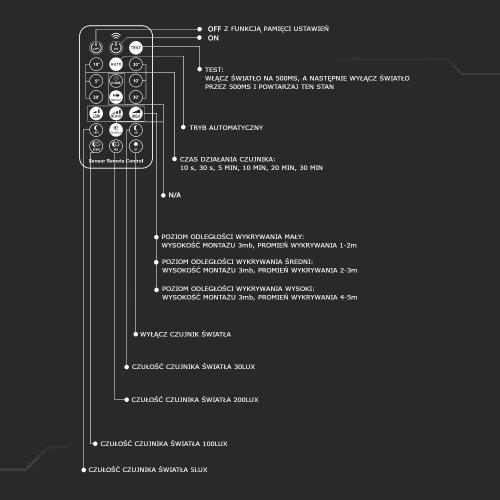 W zestawie pilot umożliwiający precyzyjne programowanie pracy czujnika ruchu