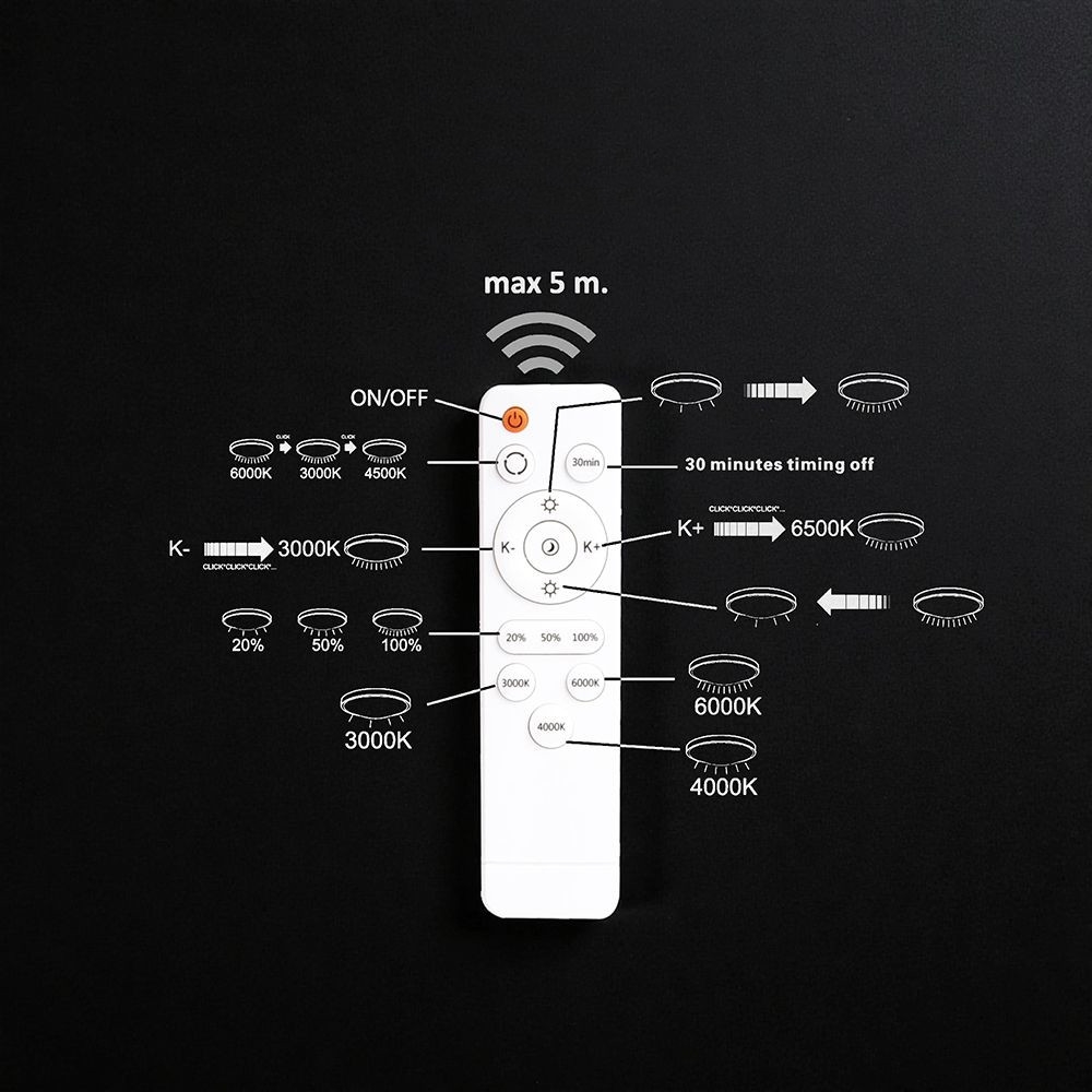 Oprawa została zaprojektowana z myślą o wygodzie użytkowania oraz estetyce wnętrz. Sprawdza się w przestrzeniach mieszkalnych i komercyjnych, zapewniając równomierne oświetlenie i komfort wizualny. Oprawa umożliwia włączanie i wyłączanie światła, zmianę barwy, regulację jasności oraz ustawienie wyłączenia czasowego przy użyciu pilota, co zapewnia maksymalną funkcjonalność i komfort użytkowania.