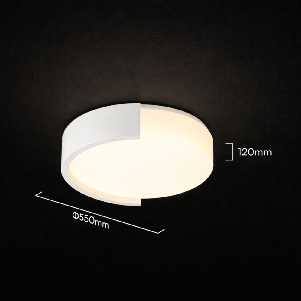 • Nowoczesna oprawa sufitowa LED typu Designer o średnicy 550 mm i wysokości 120 mm, wykonana z połączenia metalu i akrylu, w eleganckim, minimalistycznym stylu. Model 3W1 umożliwia zmianę barwy światła w zakresie 3000K, 4000K oraz 6000K za pomocą pilota lub aplikacji Lamp Smart Pro z funkcją Bluetooth. Oprawa oferuje płynną regulację jasności oraz tryb nocny, a także możliwość ustawienia wyłącznika czasowego.