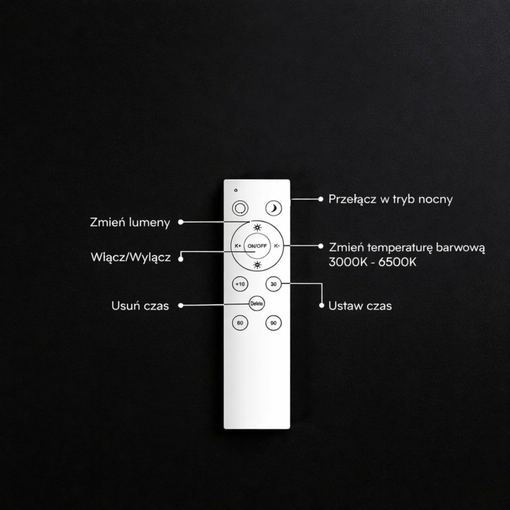 Sterowanie odbywa się za pomocą pilota, który pozwala na wygodne włączanie i wyłączanie światła, zmianę temperatury barwowej oraz płynną regulację jasności. Dodatkowe funkcje, takie jak tryb nocny oraz timer, zwiększają komfort użytkowania i funkcjonalność oprawy.