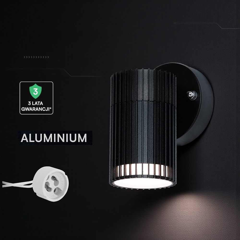 Lampa ścienna V-TAC posiada gwarancję 3 lata i stanowi nowoczesną alternatywę dla tradycyjnych opraw elewacyjnych. Obudowa wykonana z aluminium ma zwartą cylindryczną formę i czarne matowe wykończenie które dobrze komponuje się z nowoczesnymi elewacjami oraz przestrzeniami użytkowymi. Konstrukcja przeznaczona do standardowego trzonka GU10 umożliwia szybki montaż oraz dobór źródła światła zgodnie z potrzebą. Klasa szczelności IP44 zapewnia ochronę przed warunkami atmosferycznymi podczas montażu na zewnątrz lub w przestrzeniach półotwartych. Lampa sprawdza się jako oświetlenie ciągów komunikacyjnych, schodów, przejść, ścieżek oraz korytarzy w obiektach mieszkalnych i komercyjnych. Aluminium jako materiał obudowy gwarantuje długi czas życia i odporność na codzienne użytkowanie.
