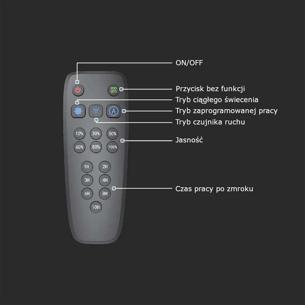 - Wyposażona w pilota zdalnego sterowania i czujnik ruchu
