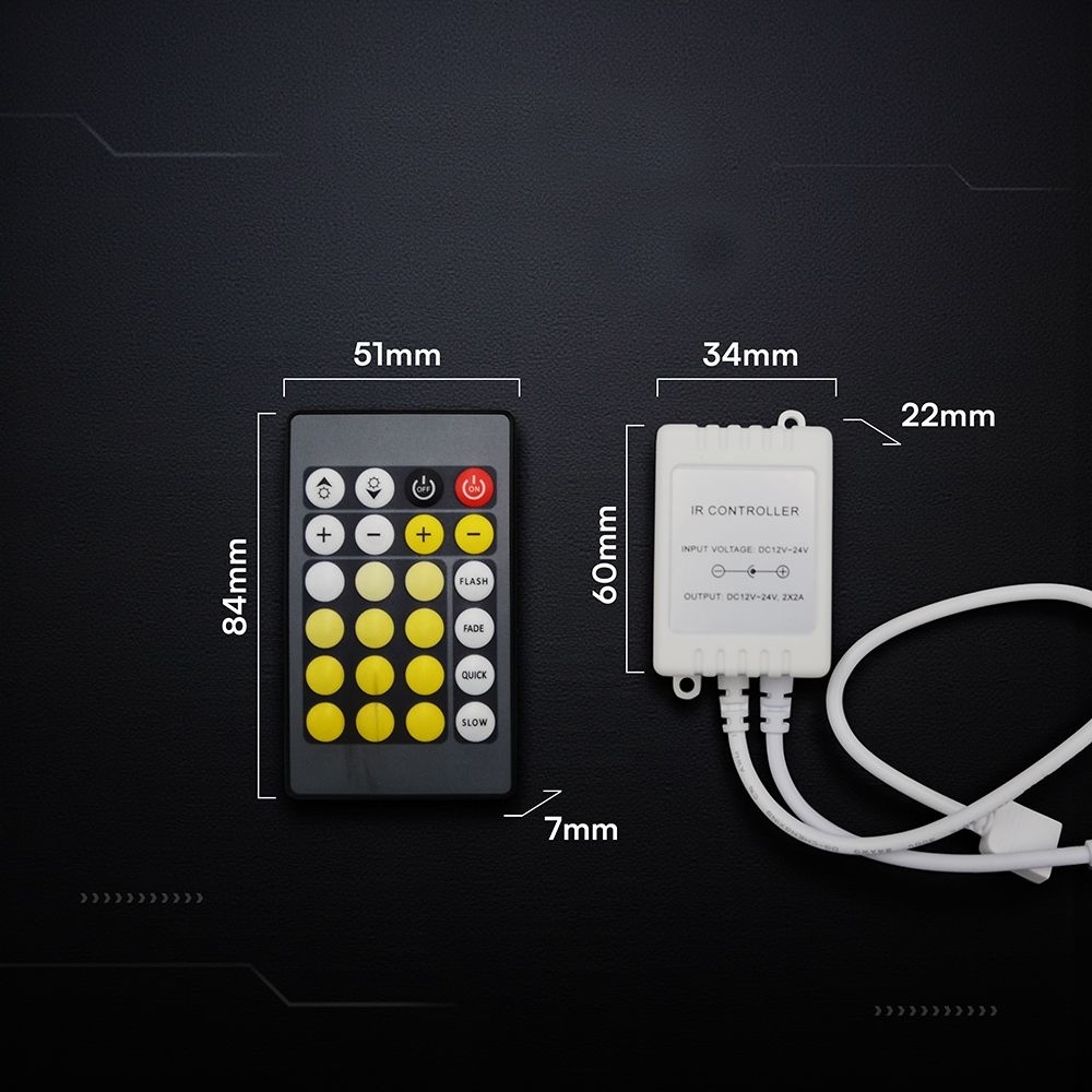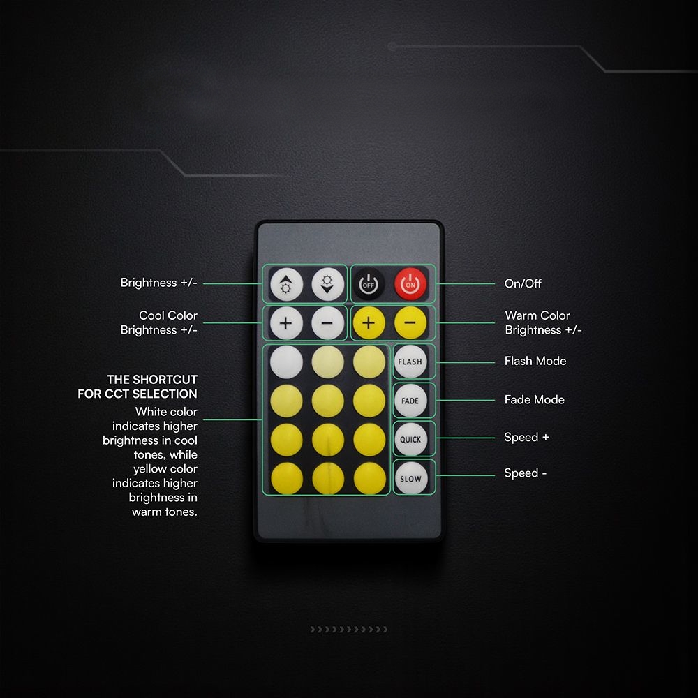Sterownik LED IR CCT z pilotem 24 przyciski, kompatybilny ze wszystkimi taśmami LED CREE CCT. Umożliwia regulację temperatury barwowej, jasności oraz wybór trybów dynamicznych. Wykonany z wytrzymałych materiałów, zapewniających lekkość i łatwy montaż. Pracuje w zakresie napięcia 12V do 24V DC. Zapewnia stabilną komunikację IR oraz długi czas życia. Na podstawie instrukcji produktowej sterownik przeznaczony jest do użytku wewnętrznego, przy maksymalnym obciążeniu 2A na każdy kolor i pracy w temperaturze od minus 20 stopni do 60 stopni.