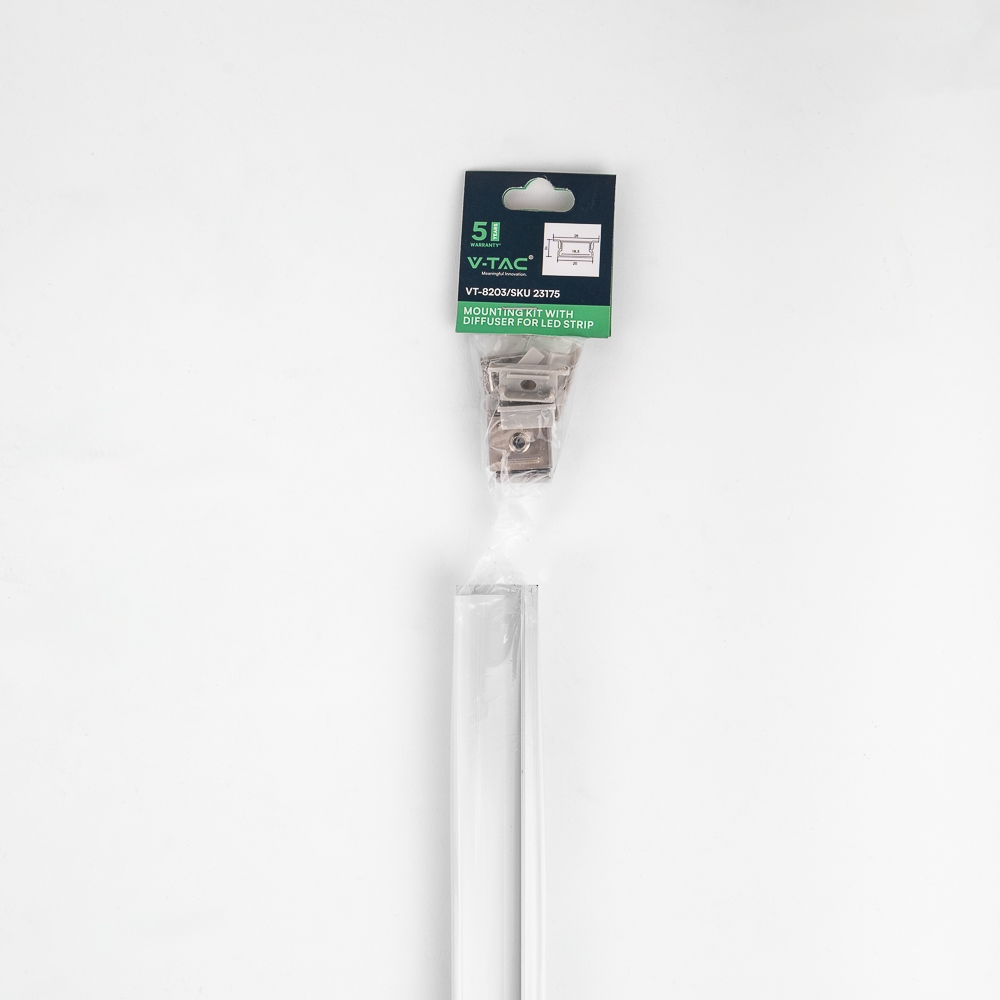 W zestawie, profil 2 metry, zaślepki końcowe, uchwyty montażowe oraz klosz mleczny