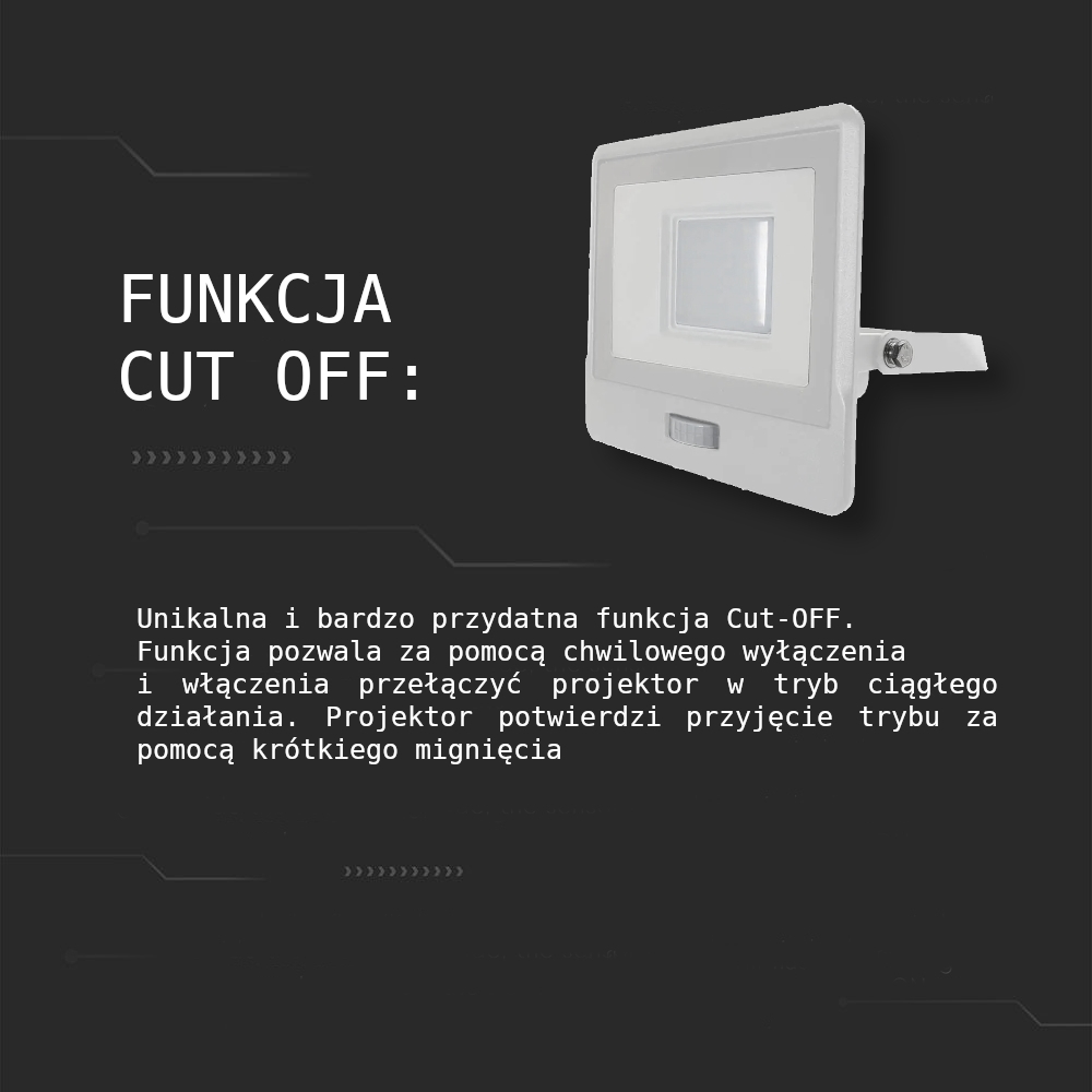 • Unikalna i bardzo przydatna funkcja Cut-OFF. Funkcja pozwala za pomocą chwilowego wyłączenia i włączenia przełączyć projektor w tryb ciągłego działania. Projektor potwierdzi przyjęcie trybu za pomocą krótkiego mignięcia